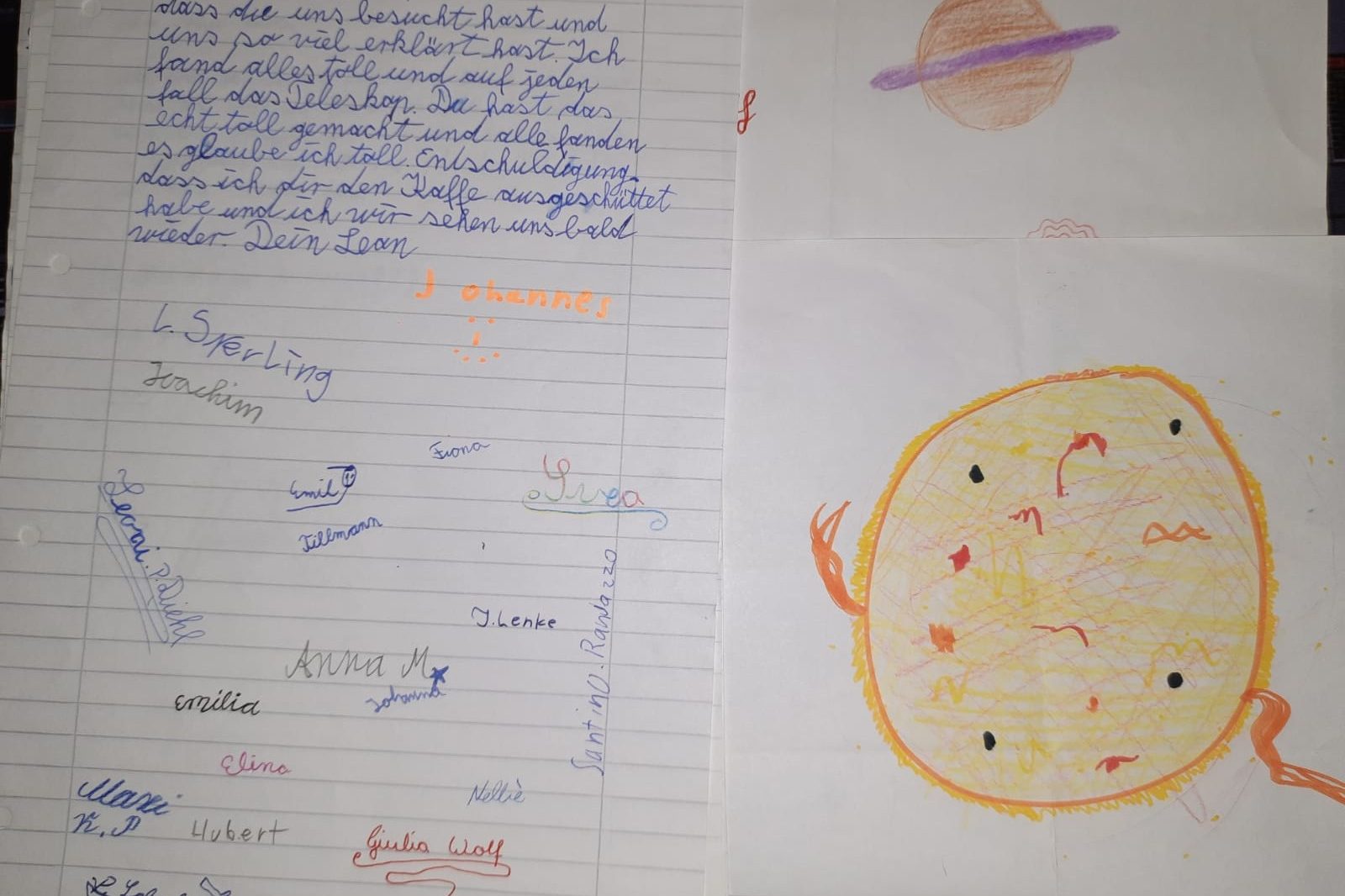 Ich habe auch schon sehr nette Fanpost aus der Grundschule Lambsheim bekommen. Nach einem Vortrag mit 50 Kindern, konnten wir gemeinsam noch die Sonne beobachten und riesige Protuberanzen sehen. Die Post hat mich sehr gefreut! Danke dafür
